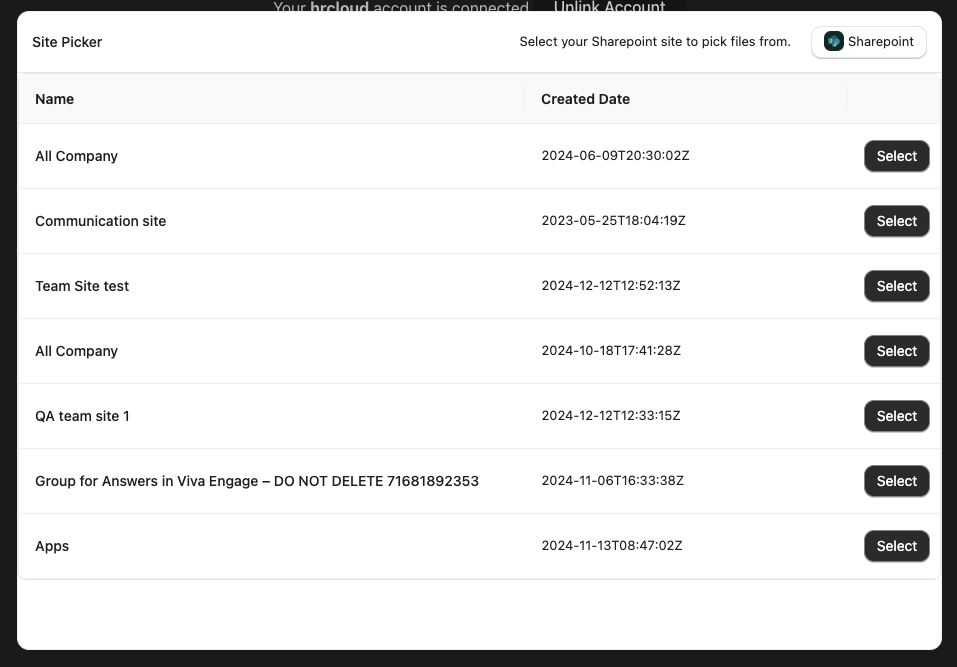SharePoint | Native | Site → Drive → Folder → File | Microsoft-native picker with StackOne-built site selection UI |