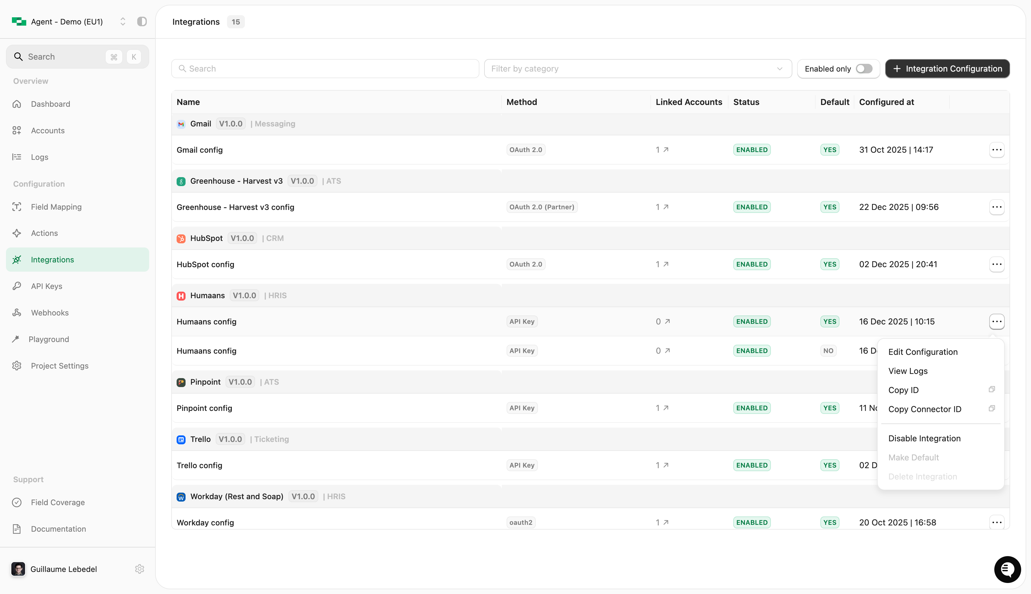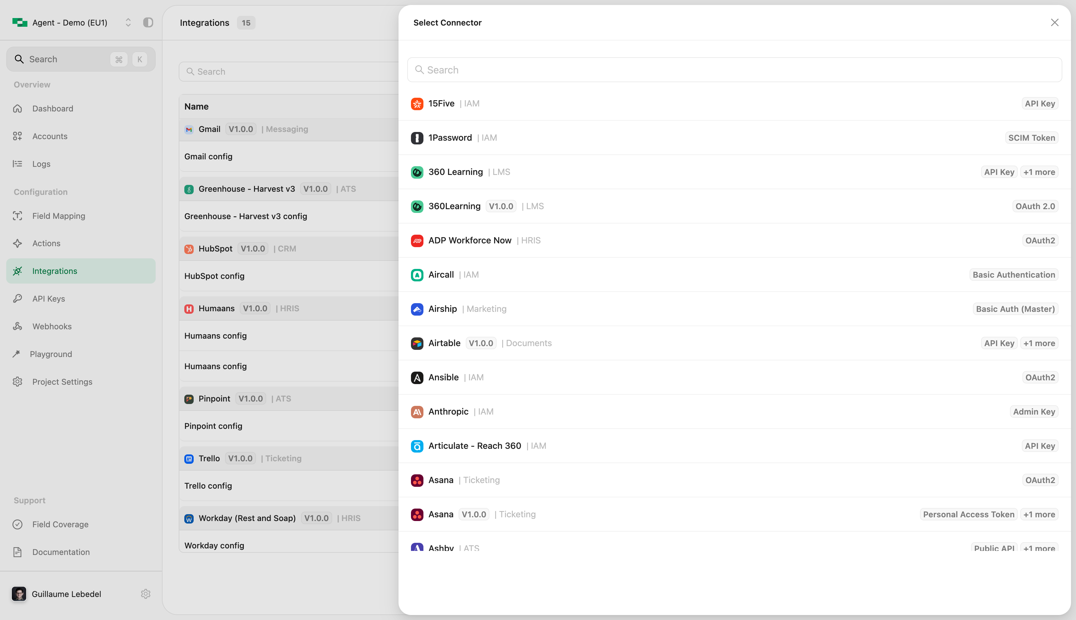 HRIS,ATS,IAM,CRM,Marketing,LMS, and more). Some connectors and categories are only available based on your plan or contract. If you do not see a category or connector that you would like, contact your support manager. - Enable, configure, and disable connectors.