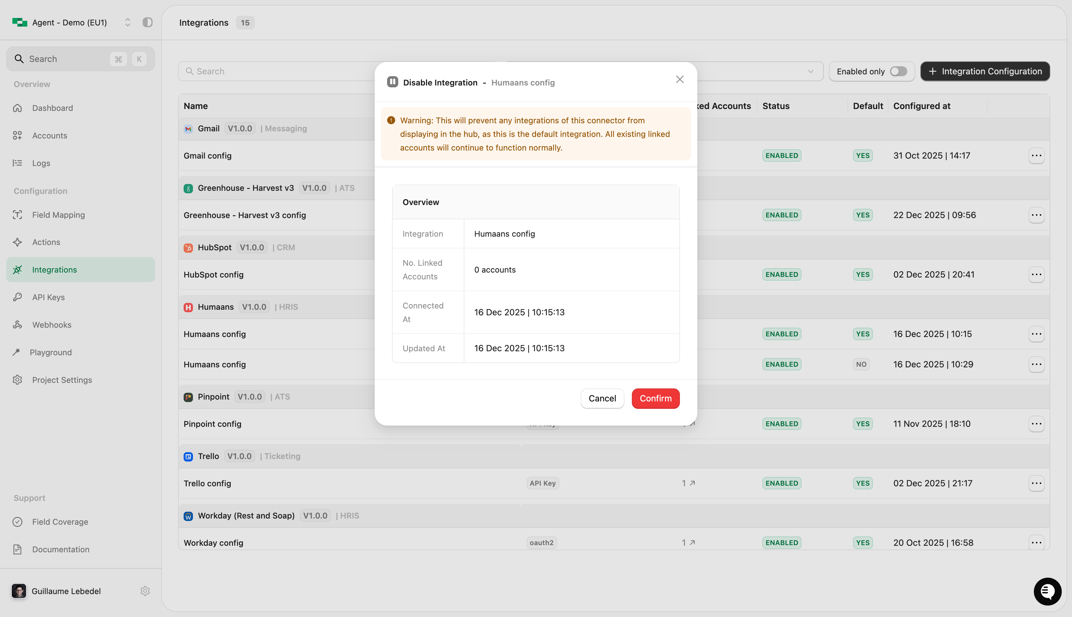 When disabling a connector, a warning will appear. Note that disabling a connector with linked accounts will make all those accounts go into an inactive status, and API requests to these accounts will not be permitted. You can switch any connector back to an enabled state just as easily, which will reset all associated linked accounts to an active status.