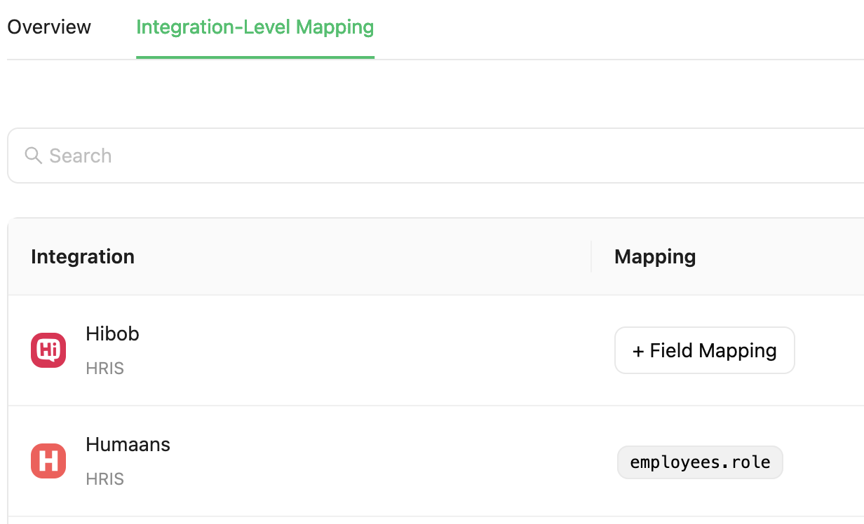 Viewing Mappings: : once an integration mapping is configured, the source will be visible directly in the integration-level mapping list: