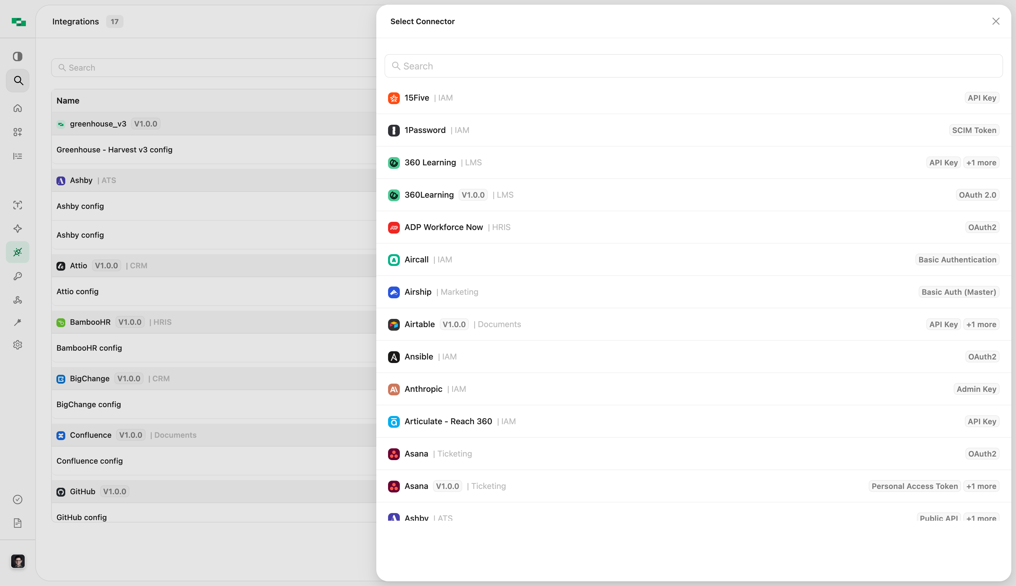 HRIS,ATS,IAM,CRM,Marketing,LMS, and more). Some connectors and categories are only available based on your plan or contract. If you do not see a category or connector that you would like, contact your support manager. - Enable, configure, and disable connectors.