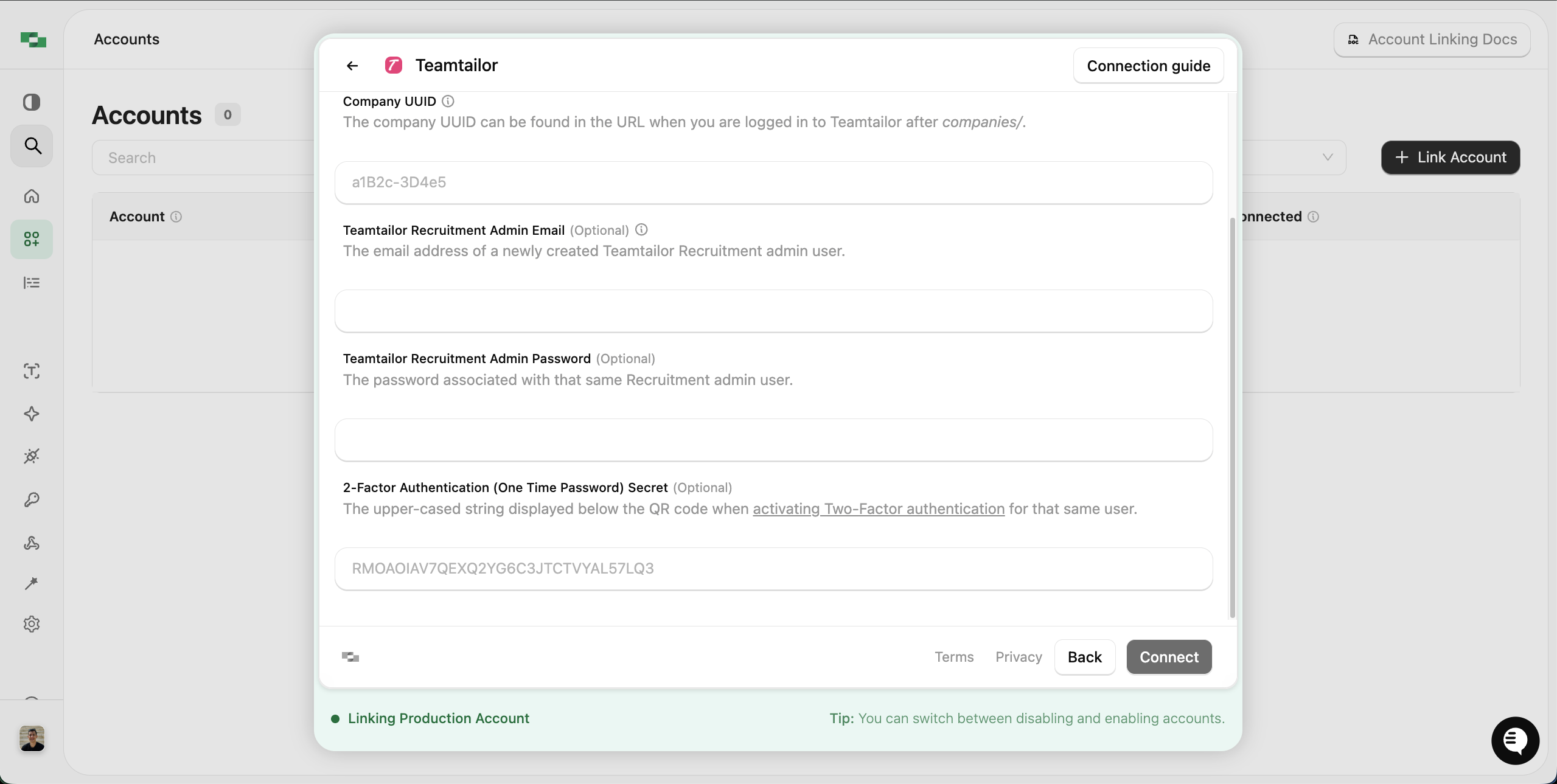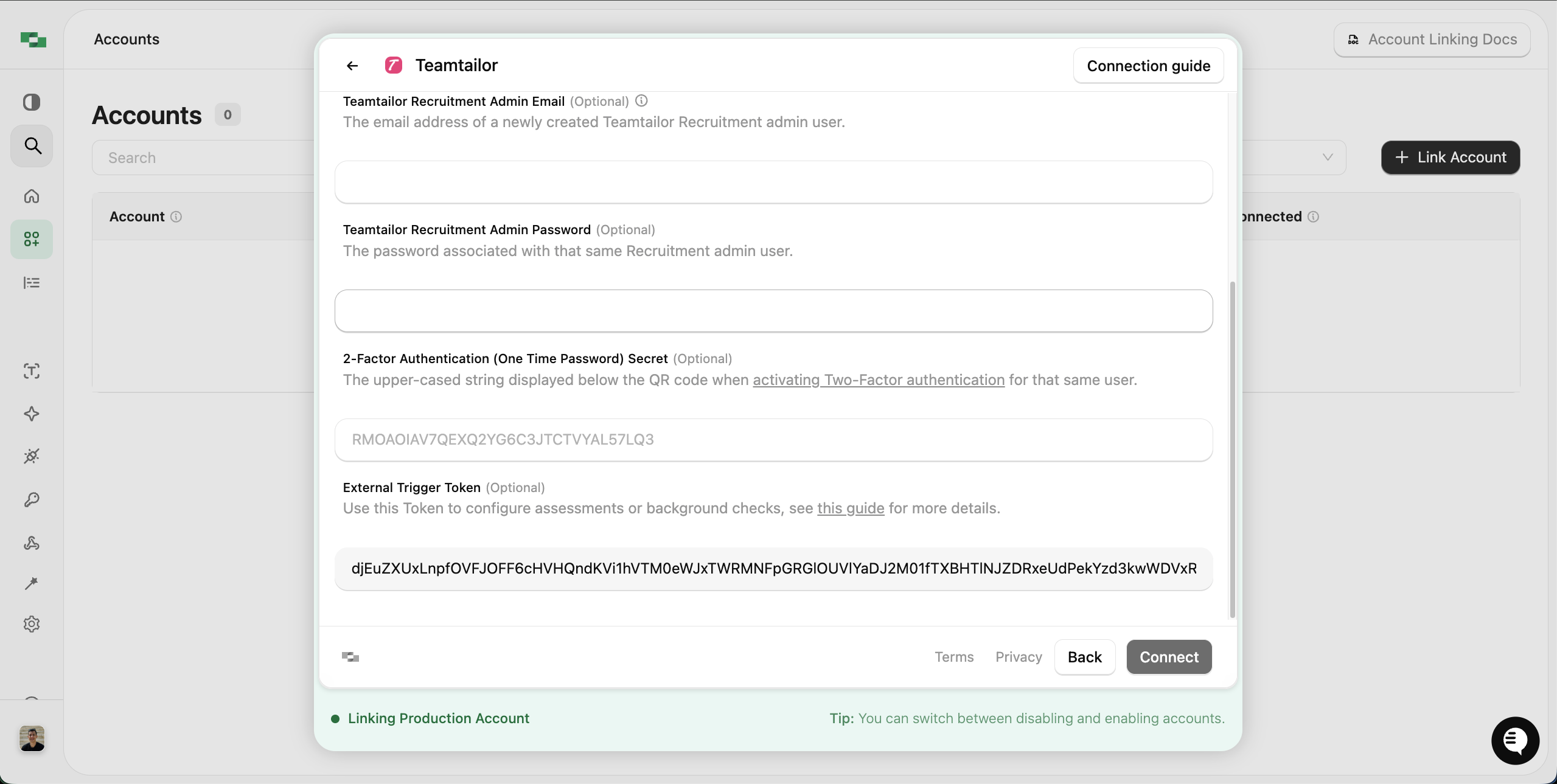 When setting up or updating a connector, you are configuring a specific authentication type. The authentication type determines the process for your end-user to link their account for that provider, specifically which details or credentials they will need to submit.API Key and Basic Token