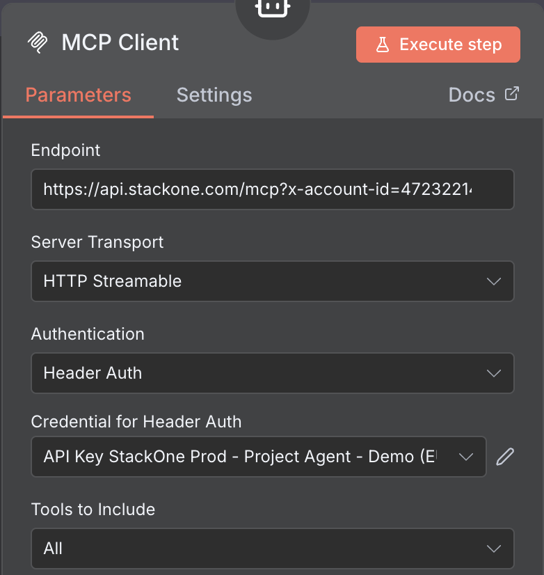 Once configured, you can create automation workflows using the MCP Client Tool node to execute actions on the StackOne linked account you specified in the server URL.Next Steps
